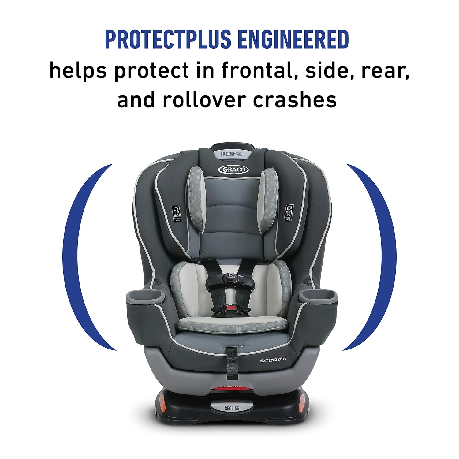 The Graco Extend2Fit Convertible Car Seat grows with your child from rear-facing harness (4-50 lbs) to forward-facing harness (22-65 lbs). It features a 4-position extension panel that provides up to 5” of extra rear-facing legroom, allowing your child to safely ride rear-facing longer. Children are safer riding rear-facing and should ride rear-facing as long as possible, until they reach the maximum rear-facing height or weight rating for their car seat. With Extend2Fit, the adjustable extension panel and 50 lbs rear-facing weight limit allow the seat to grow with your child in rear-facing mode, providing extended rear-facing use. The seat features the No-Rethread Simply Safe Adjust Harness System, which allows you to adjust the height of the headrest and harness in one motion, and InRight LATCH for a one-second LATCH attachment. Harnessing is made easier with fuss-free harness storage pockets that conveniently hold the harness out of the way while you get baby in and out of the car seat. This car seat is Graco ProtectPlus Engineered to help protect in frontal, side, rear, and rollover crashes.